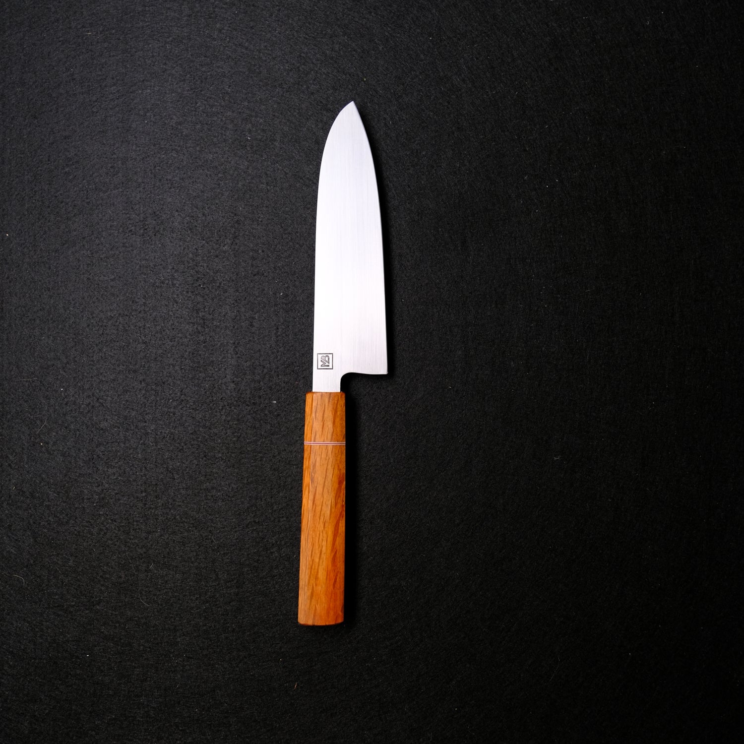 Shorter than a Gyuto, with a slightly flatter belly that’s handy for scooping food off chopping boards. Some people find Santokus less intimidating to use than Gyutos. A great all-rounder.