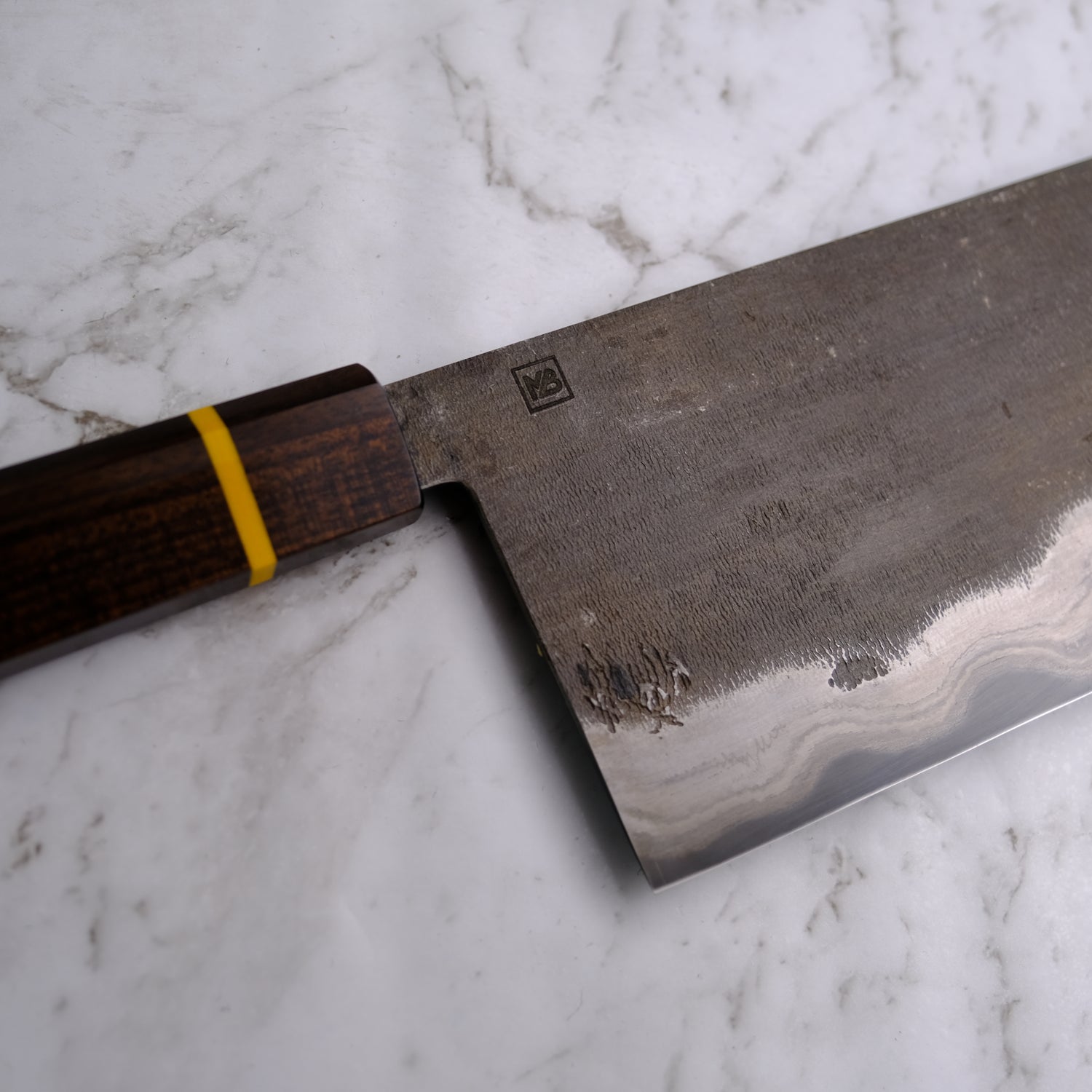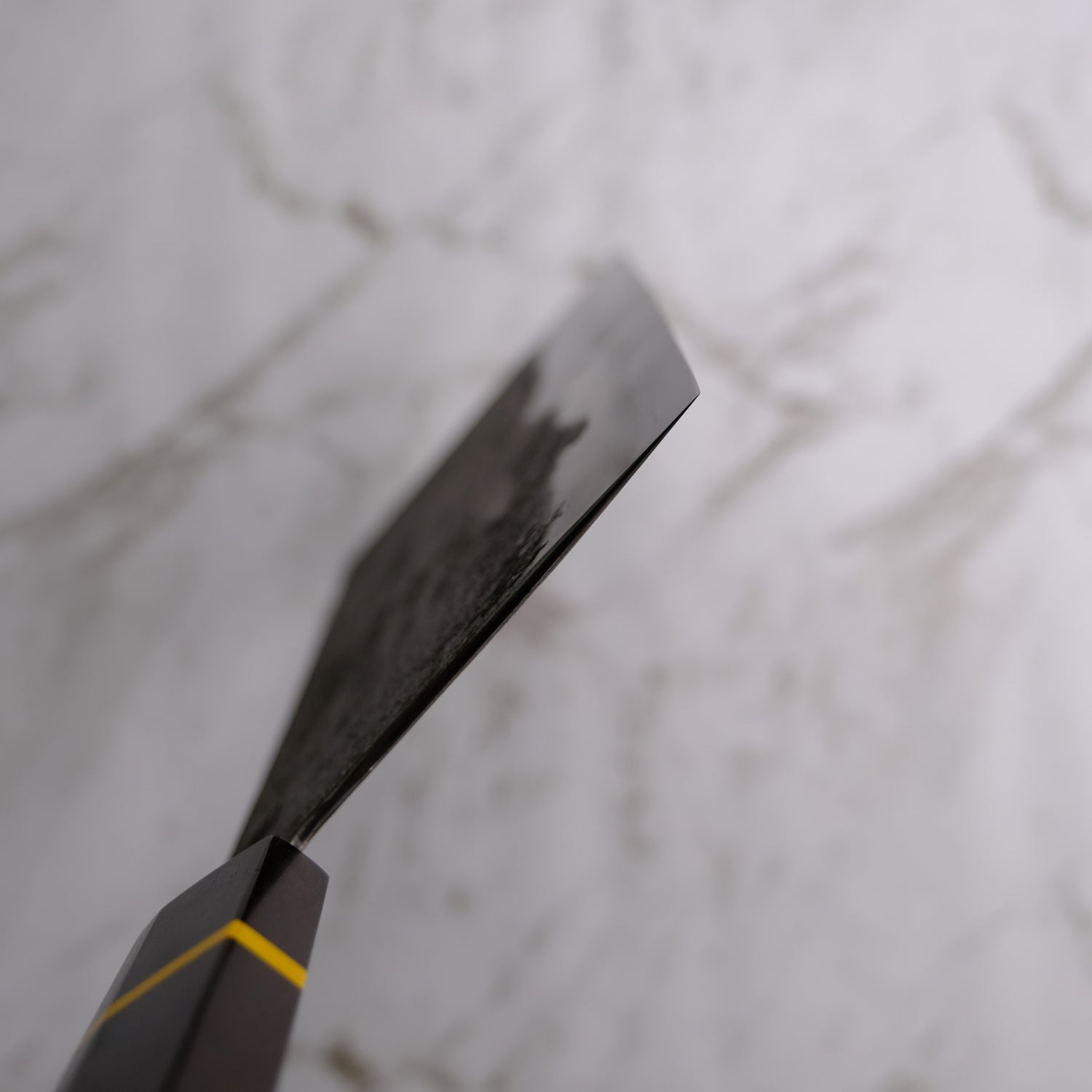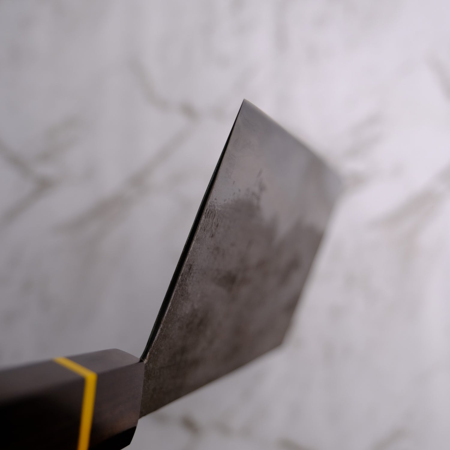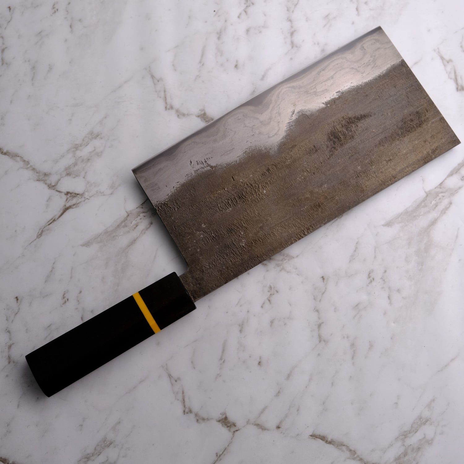 The cleaver is hand forged from a san mai of 52100 high carbon steel and wrought iron with a brute de forge finish. The flat grind has a slight convex at the tip to aid with food release. As with all my knives the spine and the choil are rounded for comfort and the handle features some mineralised Tasmanian Blackwood and a yellow G10 spacer.