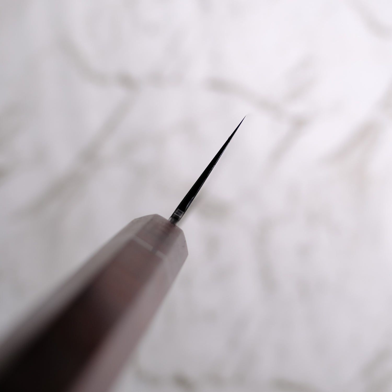Gyutos are the workhorse of a kitchen and are designed to handle most kitchen tasks. This knife is a 225mm san mai of damascus over a high carbon core and features a brute de forge finish.
