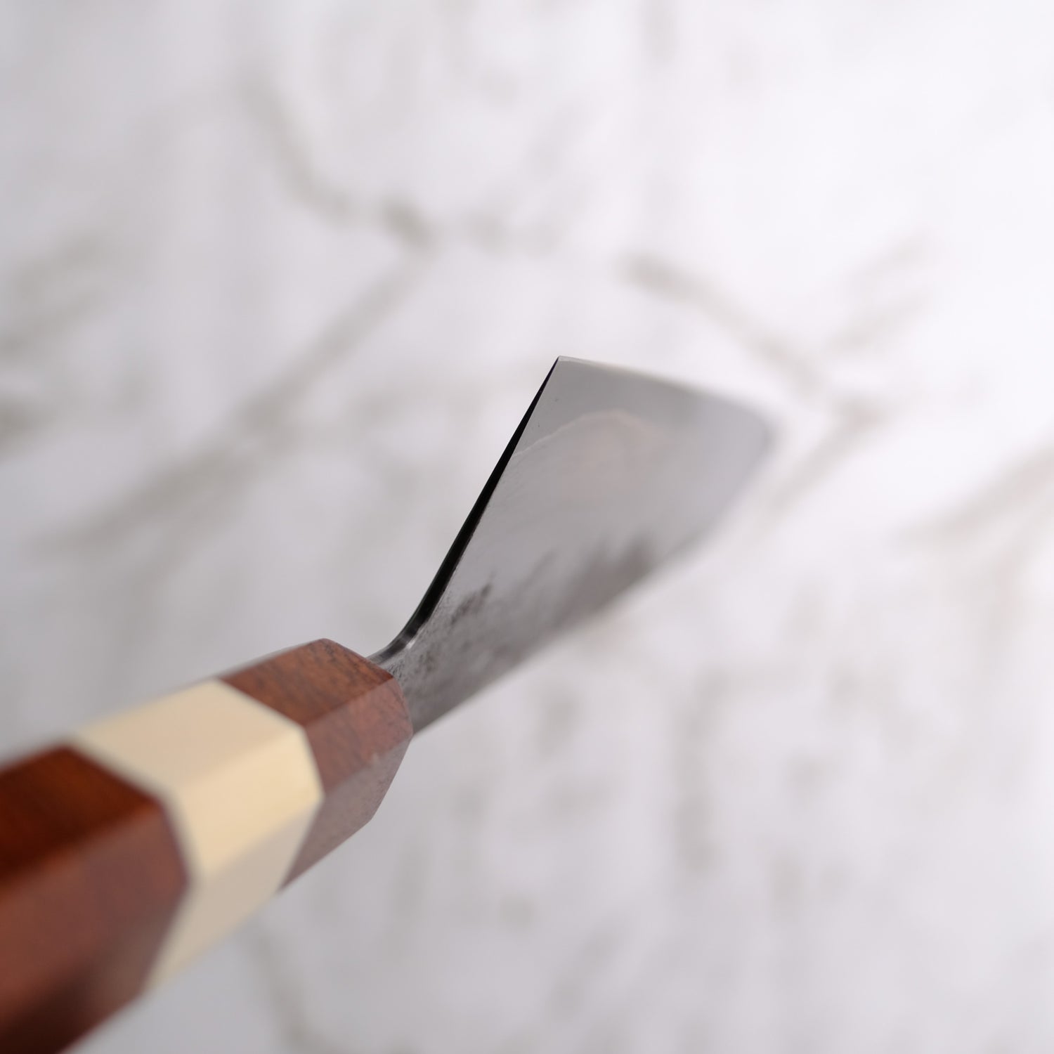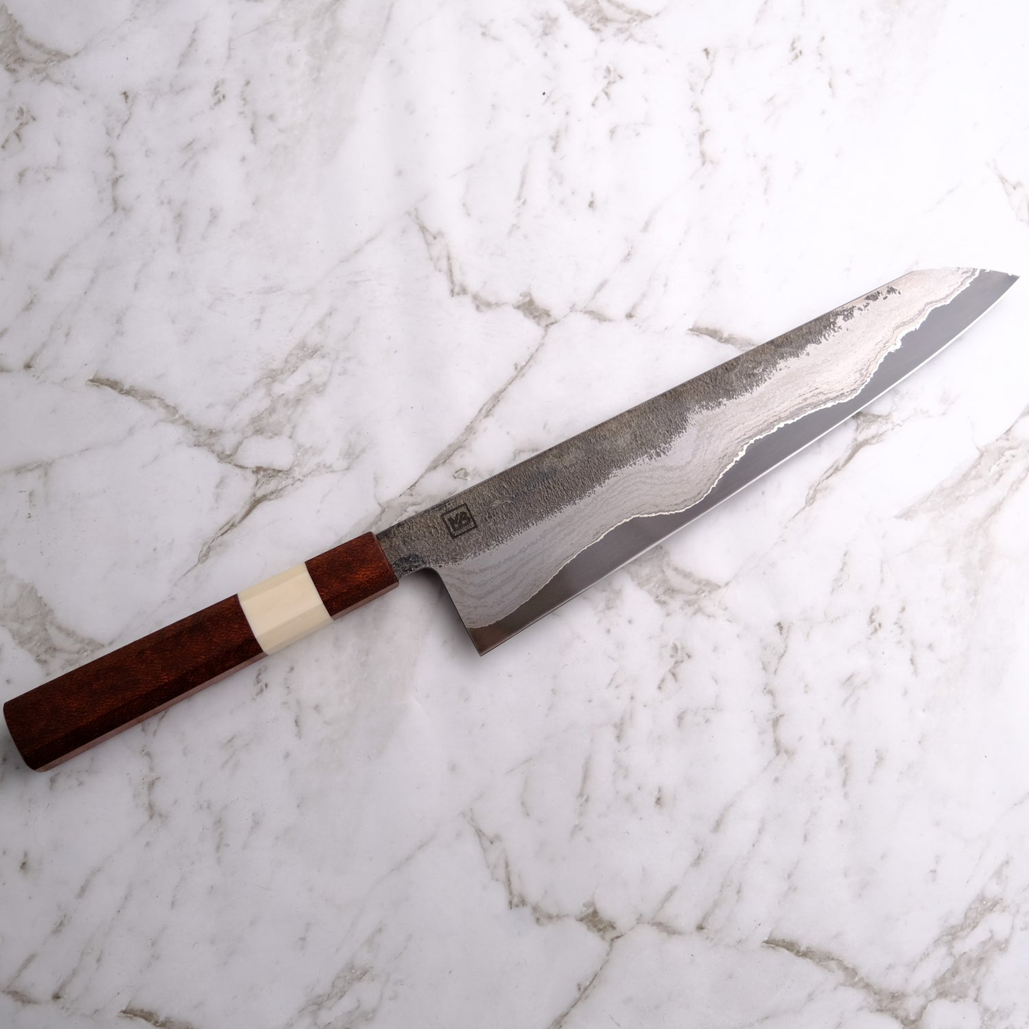 The gyuto is hand forged from a go mai of 52100 for the cutting edge and wrought iron and pure nickel for the cutting edge. The WA handle is made out of a piece of beefwood with a faux white ivory spacer made our of a Juma a resin based material.